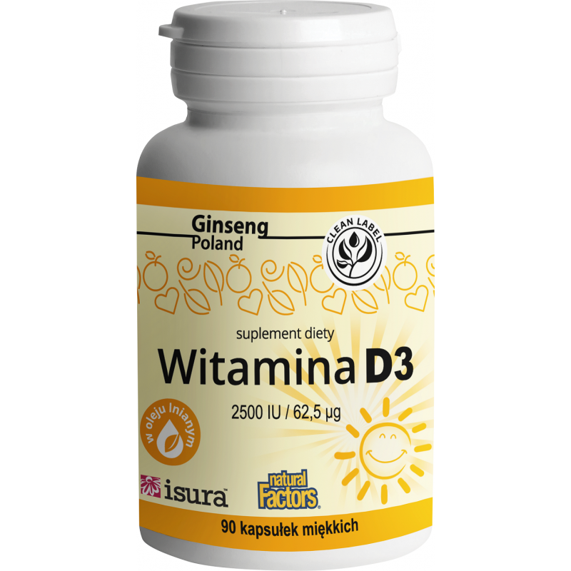 Witamina D3, suplement diety to połączenie witaminy D (cholekalcyferol) z olejem lnianym, ułatwiającym wchłanianie witaminy. Miękkie żelatynowe kapsułki tzw. softgel zawierają 2500 IU / 67,5 µg witaminy w 1 kapsułce.